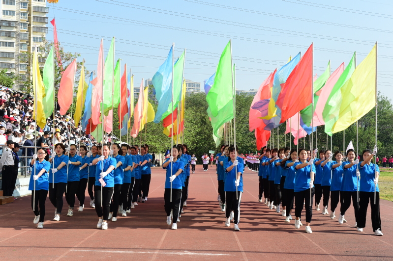 伴随着激昂的运动员进行曲,国旗队、校旗队、彩旗队、鲜花队、
