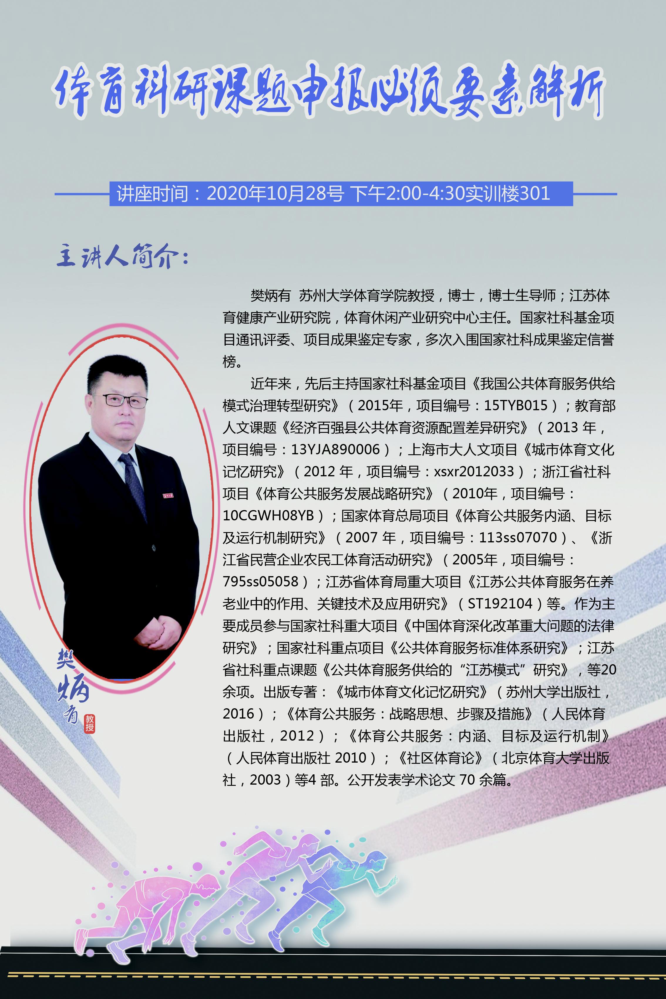 2020年10月28日下午,在实训楼301会议室人人精品无人区亚洲精品召开了以“体育科研课题申报必须要素解析”为主题的学术讲座。本次讲座邀请到苏州大学人人精品无人区亚洲精品博士生导师樊炳有教授,并由人人精品无人区亚洲精品副院长金梅教授主持,人人精品无人区亚洲精品全体教师及学生参加。