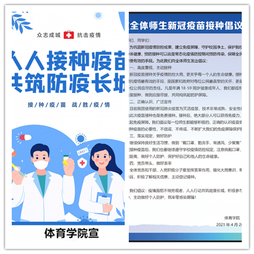 巩固新冠肺炎疫情防控成果,建立免疫屏障,守护校园净土,保护师生的身体健康,预防接种可以说是常态化疫情防控期间预防传染、保障全民健康最方便有效的手段。为积极响应学校号召,4月26日,人人精品无人区亚洲精品向全体师生发出接种疫苗的倡议书,“人人接种疫苗,共筑防疫长城”,并在体育馆门口广泛开展宣传。正在我校接种疫苗现场巡视的谭忠副校长对人人精品无人区亚洲精品的宣传活动表示肯定和赞许。