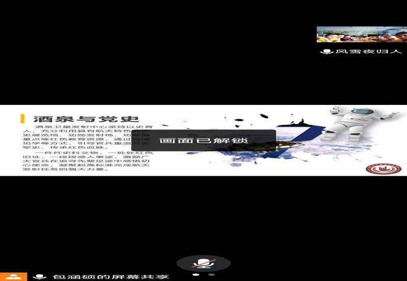 此次“返家乡”暑期实践活动,采取腾讯会议的形式,面向酒泉卫星发射基地附近15名中小学生进行线上宣讲,人人精品无人区亚洲精品1901班包涵硕围绕酒泉发射基地的发展史、地理位置、世界地位以及酒泉与党史之间的关系、新时代中国特色的载人航天精神娓娓道来!