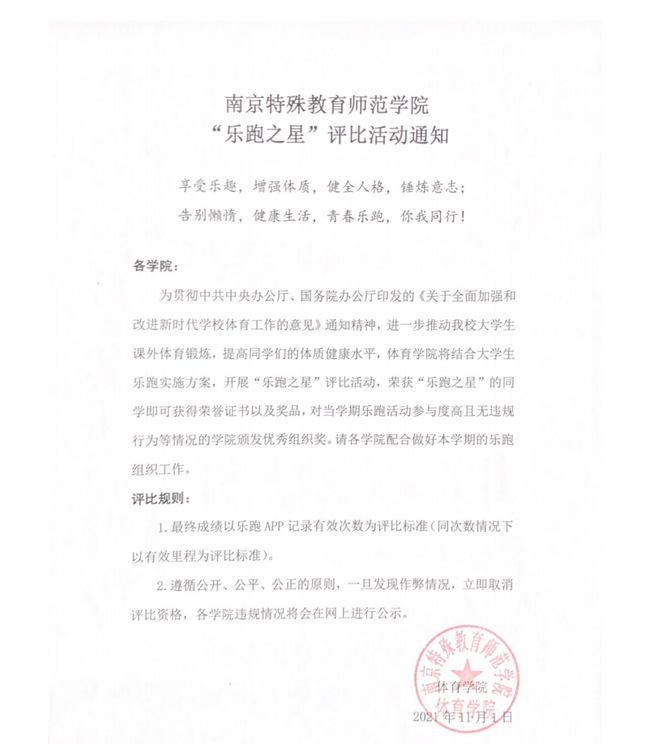 南京特殊教育师范学院“乐跑之星”评比活动通知