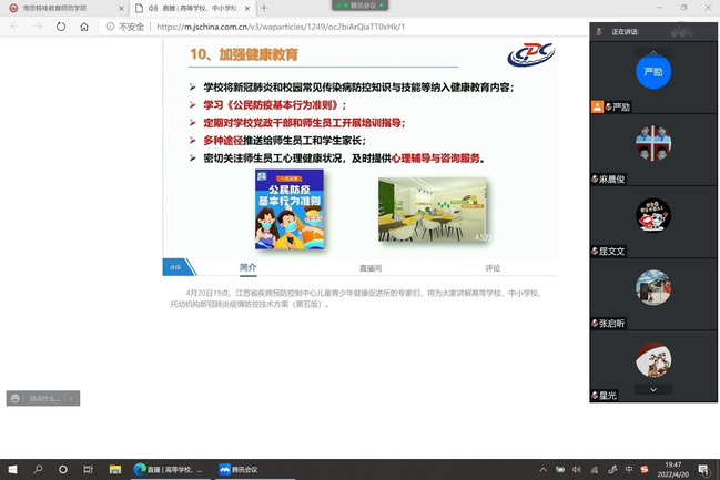培训会由江苏省疾病预防控制中心儿童青少年健康促进所的专家们,为大家讲解高等学校、中小学校、托幼机构新冠肺炎疫情防控技术方案(第五版)。高等学校新冠肺炎疫情防控技术方案(第五版)增加了校园常态化监测预警,细化了疫情出现后的应急处置措施,对开学返校准备、在校管理、疫情监控与应急处置方面做了全方位指导。培训会后,人人精品无人区亚洲精品直属党支部书记张启昕提出,要重视本次培训内容,以高度的责任感抓细抓实学院各项疫情防控措施,做好疫情防控常态化工作,筑牢疫情防控坚固防线,一起努力做好校园疫情防控工作。