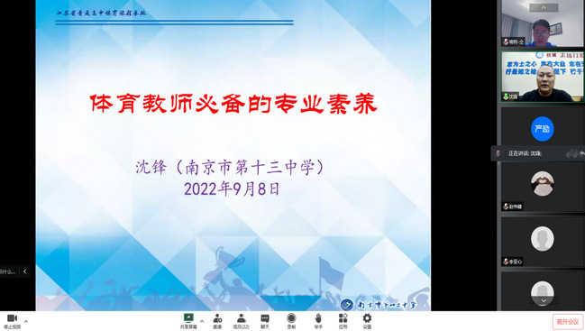 随后,由南京市第十三中学高级教师沈锋老师围绕体育教师必备的专业素养为全体实习生开展一次专题讲座。沈锋老师首先分析了我国体育教师专业化发展的现状以及专业素养的四大要素,并结合自身多年的中学体育教学经验,从体育教学技能的提升、教学计划的制定等方面为同学们提供了许多宝贵建议。在互动环节,针对同学们关心的问题和面临的困惑,沈老师也给予了细心、全面的解答。本次专题讲座内涵深刻、内容丰富,同学们受益匪浅,通过本次讲座增强了同学们的职业认同感,对如何成为一名合格体育教师有了全新的认识。