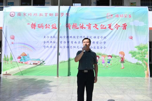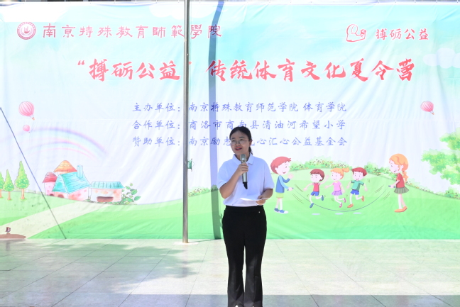 支教队队长梁一端介绍了此次夏令营即将开展的五步拳、武术操、三路长拳等传统体育文化相关课程,并表示将恪守从教准则,发扬“更高、更快、更强、更团结”的体育精神,用年轻的奉献和冲劲投入到乡村支教事业中。