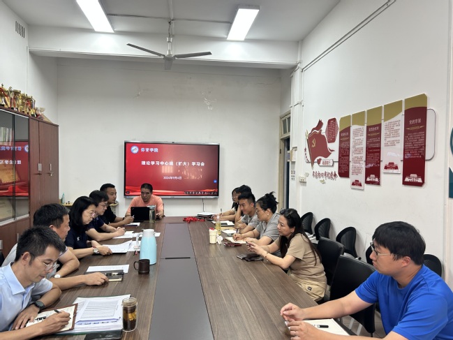 9月4日下午,人人精品无人区亚洲精品直属党支部召开理论学习中心组(扩大)学习会,学院领导班子成员、支委委员、系主任、副教授以上教师参会。会议由学院直属党支部书记陶刚主持。