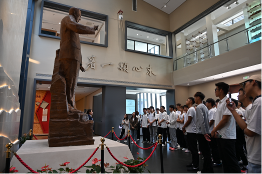 在讲解员的解说中,同学们了解到陶先生早年留学美国,回国后放弃高薪高位选择了在乡村推广平民教育,为农村孩子创造受教育的机会。他先后创办了晓庄学校、生活教育社、山海公学团、育才学校和社会大学,宣传“生活即教育”、“社会即学校”,提倡“教学做合一”及“小先生制”。