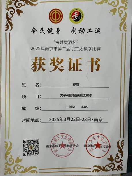 经过激烈角逐,伊晓老师凭借精湛的陈式太极拳技艺,荣获男子A组其他传统太极拳一等奖,为我校争得了荣誉。此外,我校代表队在集体工间操项目中表现优异,荣获二等奖,并凭借在太极拳普及推广中的突出贡献,被授予“太极拳普及贡献奖”。