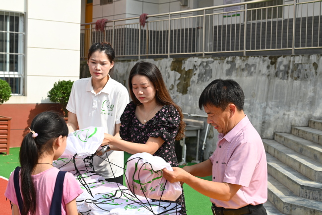随后,吴盛发副校长宣布本次夏令营正式开营。校领导和支教指导老师李烨为小朋友分发夏令营物资包并合影留念。