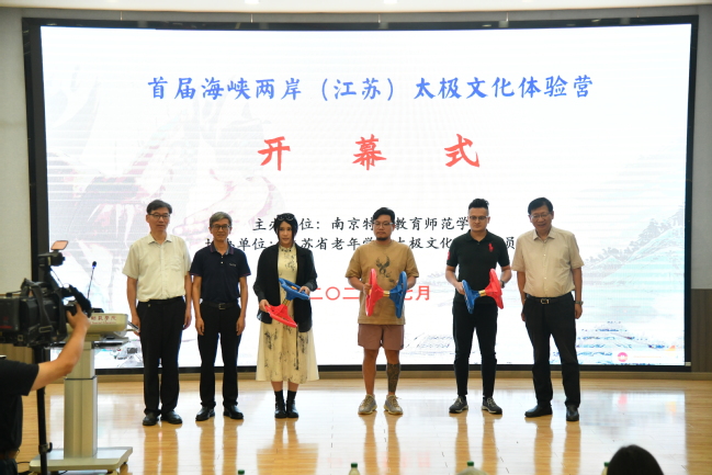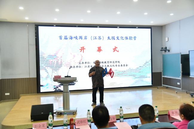 为弘扬中华优秀传统文化,深化海峡两岸高校交流,7月19日,“首届海峡两岸(江苏)太极文化体验营”在南京特殊教育师范学院开营。本次活动由南京特师主办、江苏省老年学学会太极文化专业委员会协办,南京人人精品无人区亚洲精品、南京晓庄学院、江苏第二师范学院共同参与支持。当天,江苏省人民政府台湾事务办公室副主任封志成,江苏省人民政府台湾事务办公室交流处四级调研员戴晓辉,南京特殊教育师范学院党委副书记谭忠,江苏省老年学学会常务副会长臧建东,江苏省老年学学会秘书长姚俊,台湾宜兰县农会顾问徐宏贤,台湾宜兰县罗东镇民代表黄伟,南京理工大学体育部主任葛国政,南京师范大学体育科学学院副院长吴填,江苏经贸职业技术学院人人精品无人区亚洲精品副院长武春红,江苏省老年学学会太极文化专业委员会主任张梅瑛,江苏省老年学学会太极文化专业委员会顾问赵海鑫,南京特殊教育师范学院港澳台事务办公室主任张平等出席活动,来自台湾和江苏地区的100余位太极名家及青年太极文化爱好者参与活动。