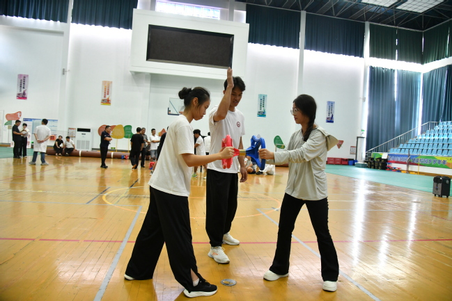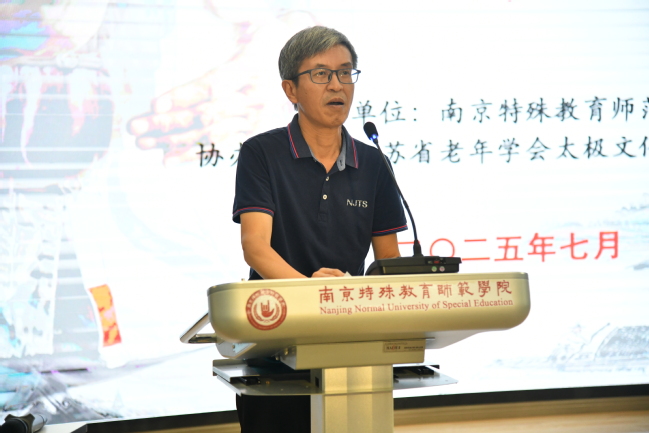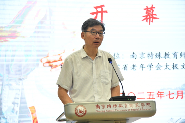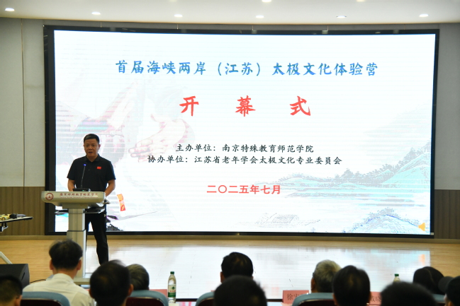 活动开幕式由南京特殊教育师范学院人人精品无人区亚洲精品直属党支部书记陶刚主持。在开幕式上,南京特师党委副书记谭忠在致辞中表示:南京特师作为全国唯一一所以特殊教育命名的本科院校,始终秉持“博爱塑魂”的校训精神,致力于推动残健融合、文化共融。此次承办海峡两岸太极文化体验营,既是学校服务国家文化战略的使命担当,更是对“以文化人、以体育人”教育理念的深化拓展。太极文化强调“刚柔并济、包容并蓄”,这与特殊教育“平等、参与、共享”的核心价值高度契合。他希望活动每一位参与者都能成为两岸文化交流的“使者”,将南京的博爱精神、太极的和谐之道带回宝岛,让更多台湾青年感受到大陆的真诚与温度。同时他表示我校将继续发挥特殊教育与文化传承的双重优势,推动两岸在残疾人事业、师范教育、非遗保护等领域的深度合作,让融合发展的道路越走越宽广。